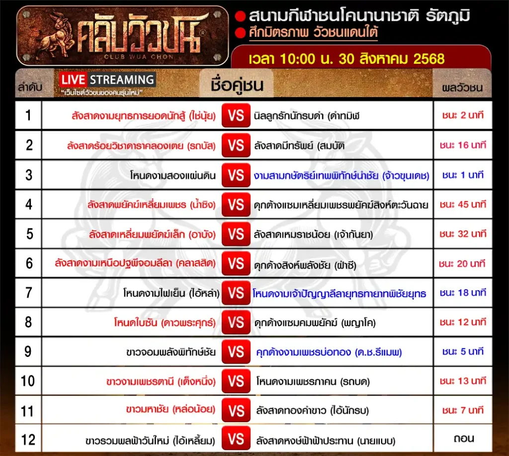 สรุปผลวัวชน สนามกีฬาชนโคนานาชาติ รัตภูมิ วันเสาร์ ที่ 30 สิงหาคม 2568 เริ่มชนเวลา 10:00 น