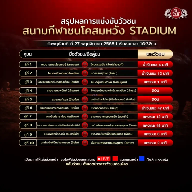แดงสิงห์ราชาน้อย (มณีแดง) VS ขาวงามราชครูยอดชูชัย (ดอกรัก) แดงชนะ 12 นาที