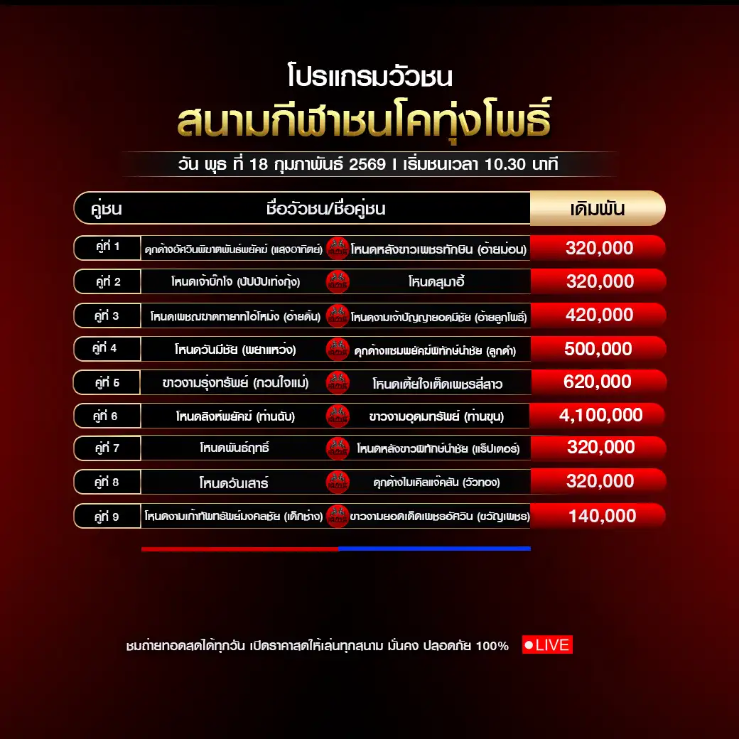 โปรแกรมวัวชน สนามกีฬาชนโคบ้านบ่อล้อ วันจันทร์ ที่ 9 มีนาคม 2569