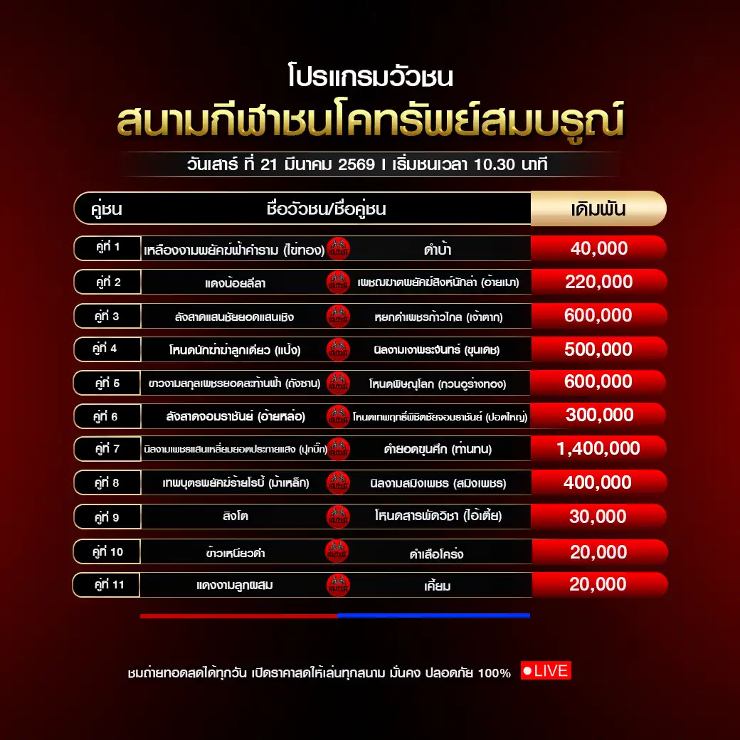 โปรแกรมวัวชน สนามกีฬาชนโคนครตรัง วันเสาร์ ที่ 7 มีนาคม 2569