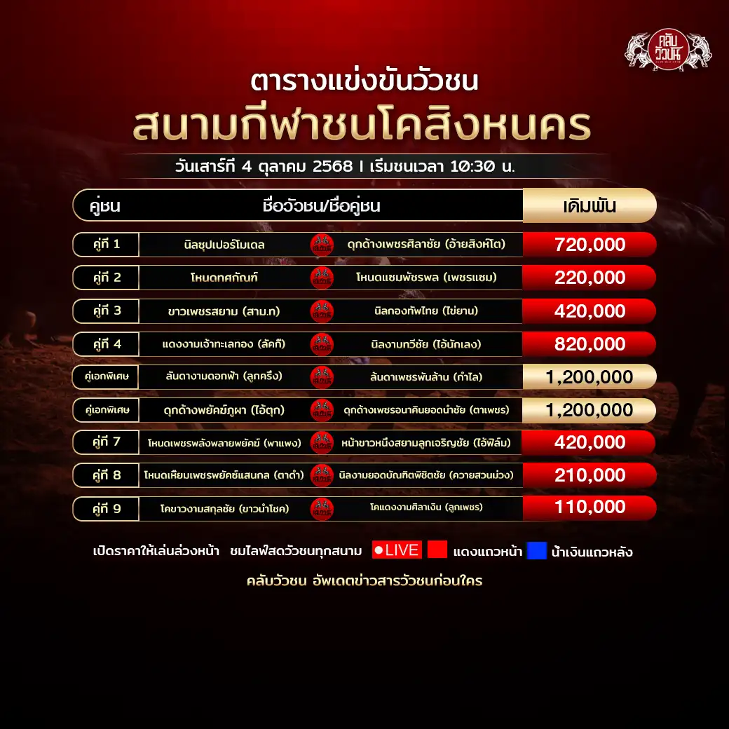 โปรแกรมวัวชน สนามกีฬาชนโคนครตรัง วันอังคารที่ 4 พฤศจิกายน 2568