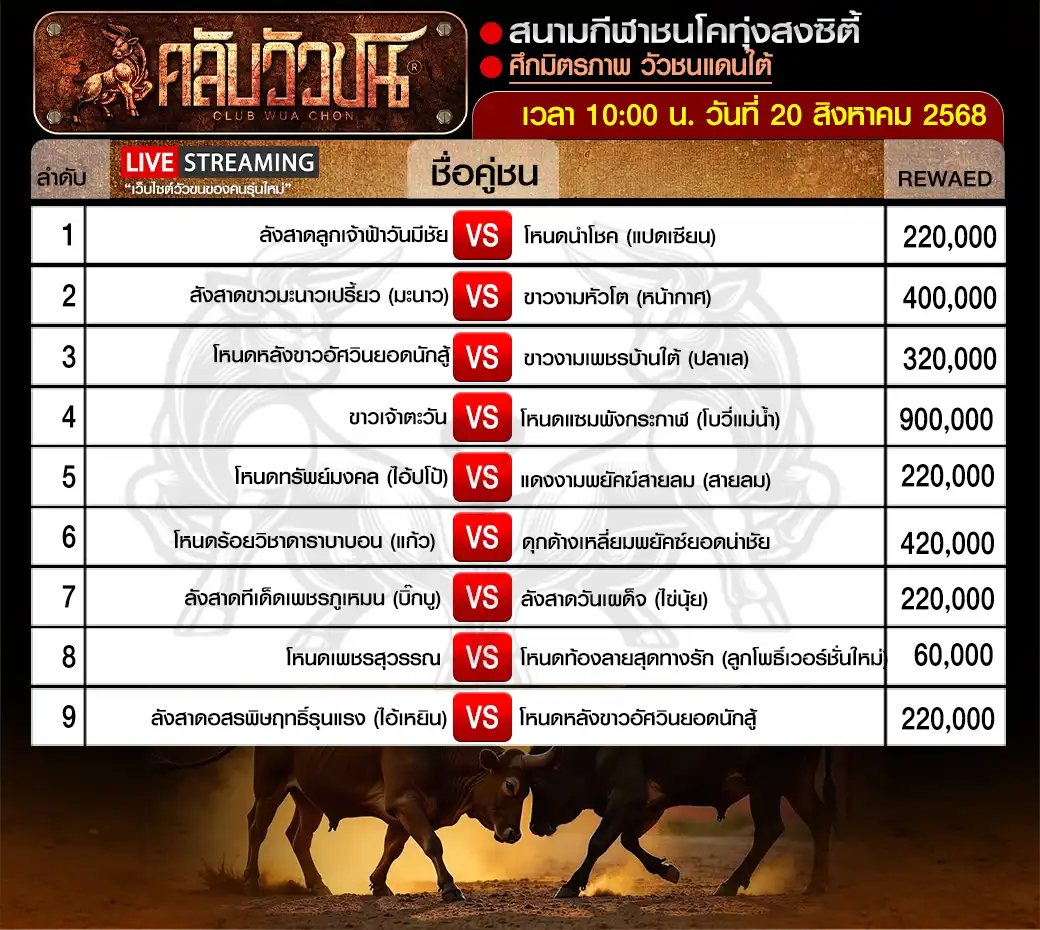 โปรแกรมวัวชน สนามกีฬาชนโคพระแสงคอมเพล็กซ์ วันอังคาร ที่ 26 สิงหาคม 2568